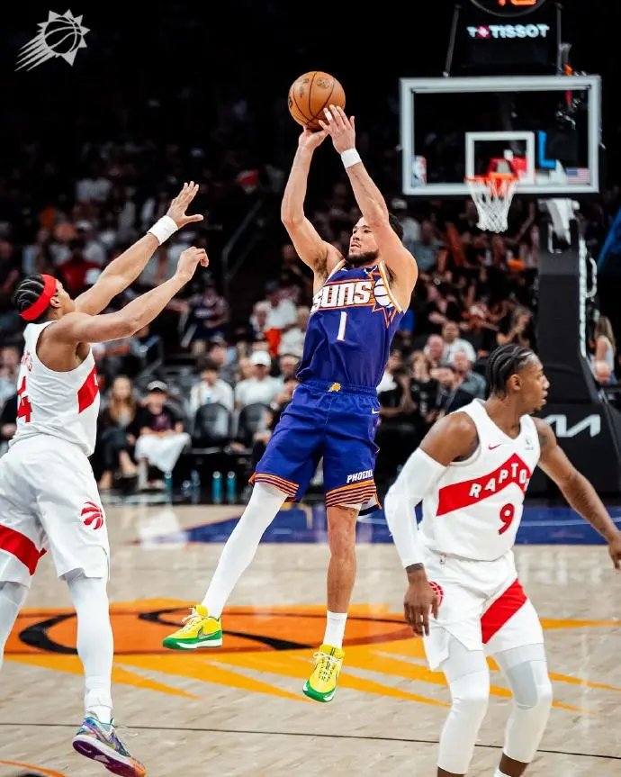 布克今天找回手感,表现出色,首发出战31分钟,投篮15中9,三分球6中3,罚球4中4,拿到25分3篮板6助攻的数据,第三节个人独得13分,正负值+32全场最高。