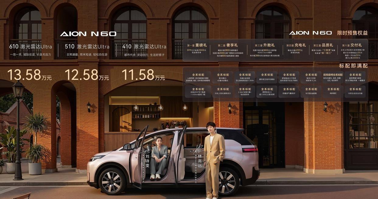 昨晚开启预售的埃安 N60 就是这波技术下放的代表车型之一,预售 11.58 的它,全系标配了高阶辅助驾驶能力。